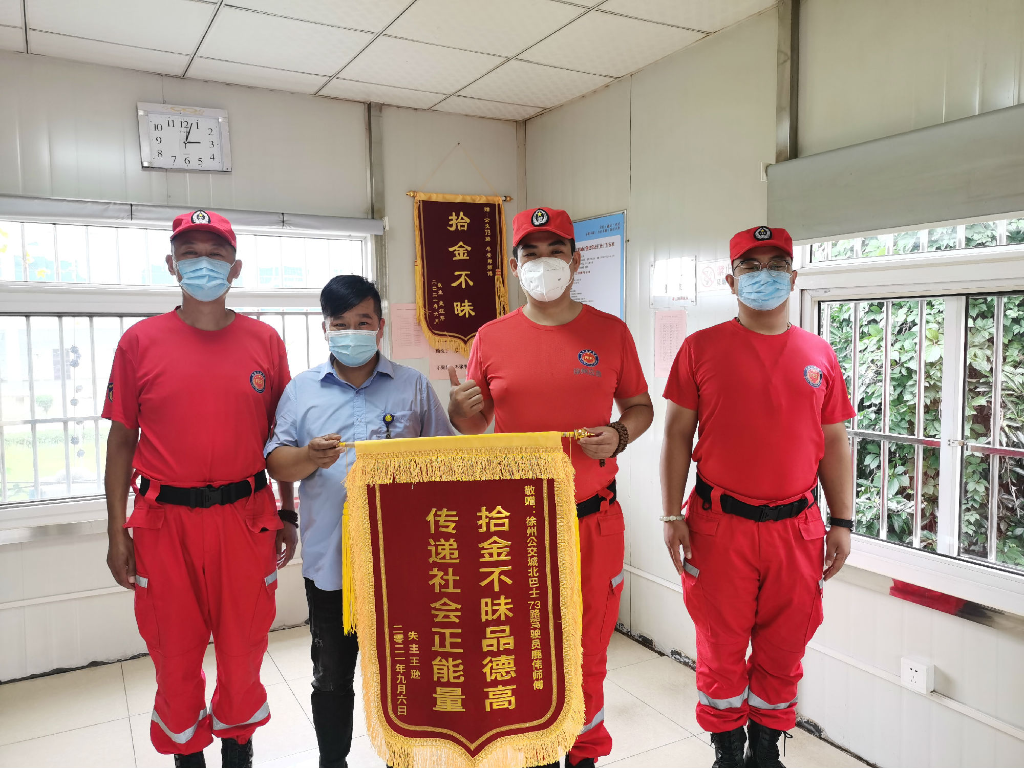 當(dāng)天上午9點(diǎn)50分左右,乘客王先生從煙廠乘坐73路趕往仁慈醫(yī)院交住院費(fèi),下車時(shí)只顧拎著大包急匆匆往醫(yī)院趕,繳住院費(fèi)時(shí)才發(fā)現(xiàn)裝有現(xiàn)金的小包沒了。王先生意識(shí)到,小包可能遺落在了公交車上,于是急忙出門打車,來到了楊山路調(diào)度室找尋,沒想到小包已經(jīng)被鹿偉師傅撿到交到了調(diào)度室。王先生緊握鹿偉師傅的手連連致謝,并撥打了12345市政熱線對其進(jìn)行了表揚(yáng)。9月7日中午,他又帶著錦旗來到楊山路調(diào)度室,再次對鹿師傅拾金不昧精神表示感謝。