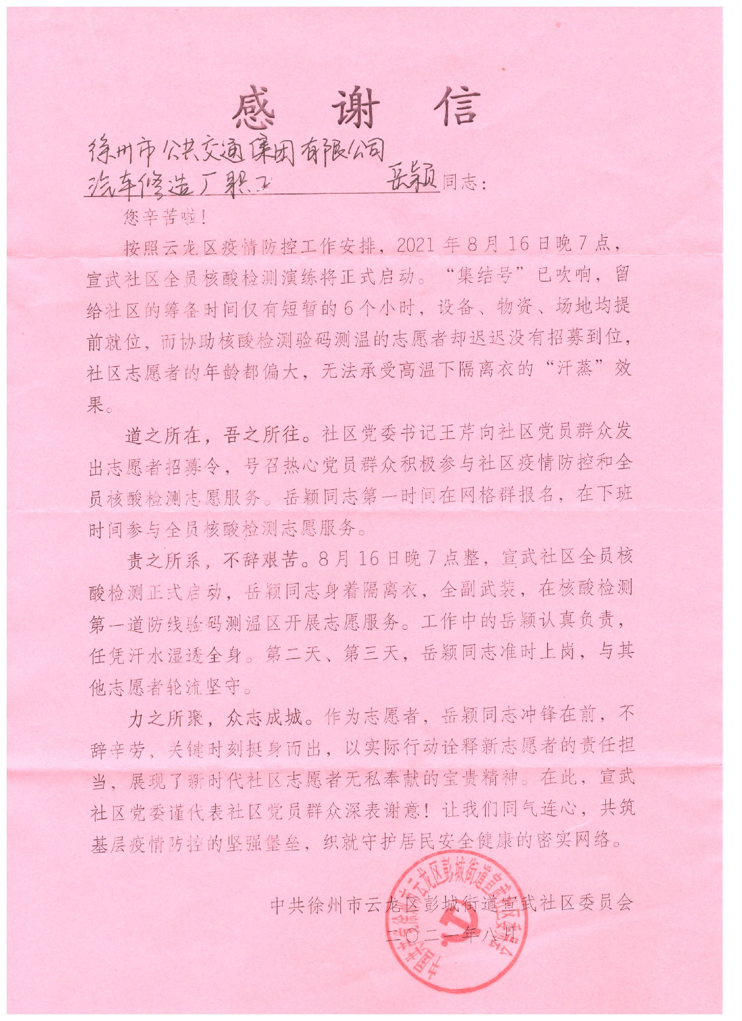 身穿防護(hù)服的岳穎在高溫的“侵襲”下堅(jiān)持完成了三天的志愿工作,岳穎在志愿服務(wù)中的出色表現(xiàn),得到了社區(qū)黨委肯定。