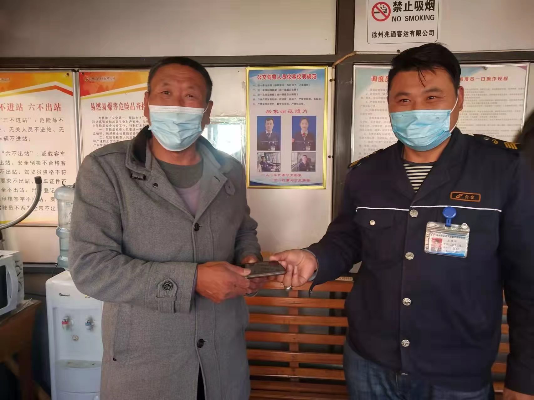 2022年3月9日早上6點多,家住銅山區(qū)房村鎮(zhèn)的梁先生在宣武市場轉(zhuǎn)乘85路公交車,由于下車匆忙,不慎把手機丟在了車上,幸虧被駕駛員吳寶撿到交到車隊。管理人員通過手機上的電話號碼聯(lián)系到失主家人,失主于下午14:20分趕到宣武車站拿回手機,并對駕駛員的這種拾金不昧的行為表示感謝!