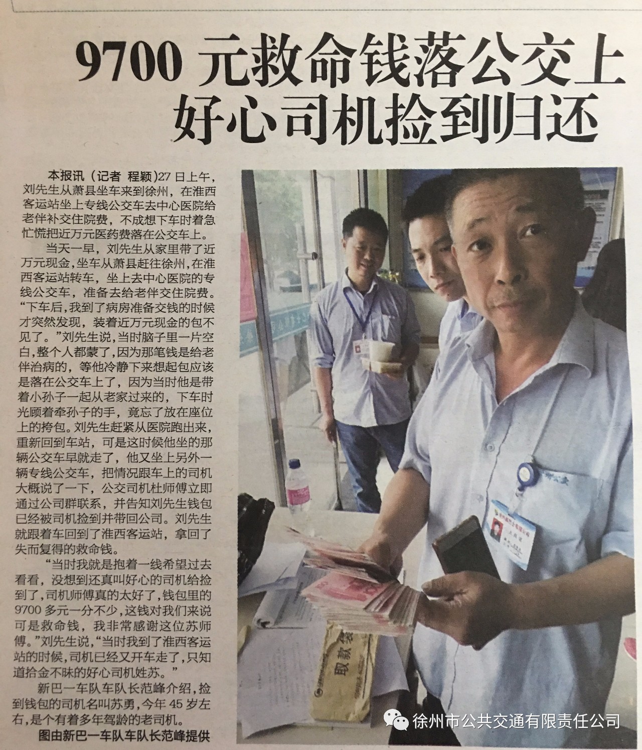 車隊(duì)管理人員打開包尋找乘客的聯(lián)系方式,發(fā)現(xiàn)包里有一個(gè)信封,信封里面裝著9700元現(xiàn)金,便立即將包妥善保管。不久,失主劉先生來(lái)到調(diào)度室尋找,看到失而復(fù)得的包裹十分激動(dòng),他說(shuō):“我抱著一線希望來(lái)這兒看看,沒想到還真叫好心的司機(jī)給撿到了,9700元一分不少。這錢對(duì)我們來(lái)說(shuō)是救命錢,今早到醫(yī)院給老伴補(bǔ)交住院費(fèi)的,我非常感謝蘇師傅”。