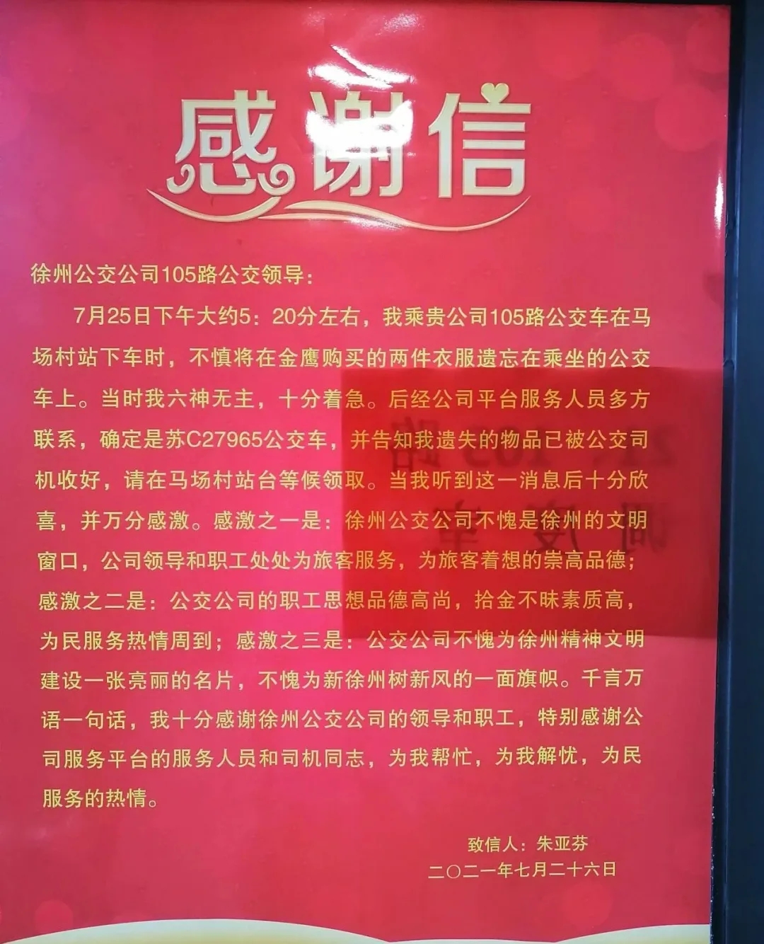 “我一時疏忽丟了東西,如果沒有袁丁師傅,我這兩套西服就不知所蹤了,真的非常感謝?!?月26日,乘客朱先生送來感謝信,對徐州公交的暖心服務表示贊許。