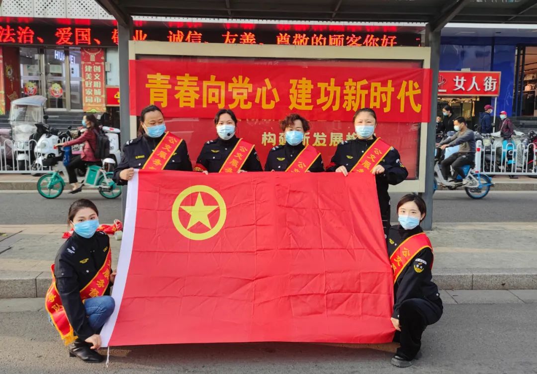 在建團100周年之際,服務督導隊黨支部組織黨員、青年團員以黨帶群團方式,走進公交站臺開展“青年心向黨 建功新時代”志愿服務活動。