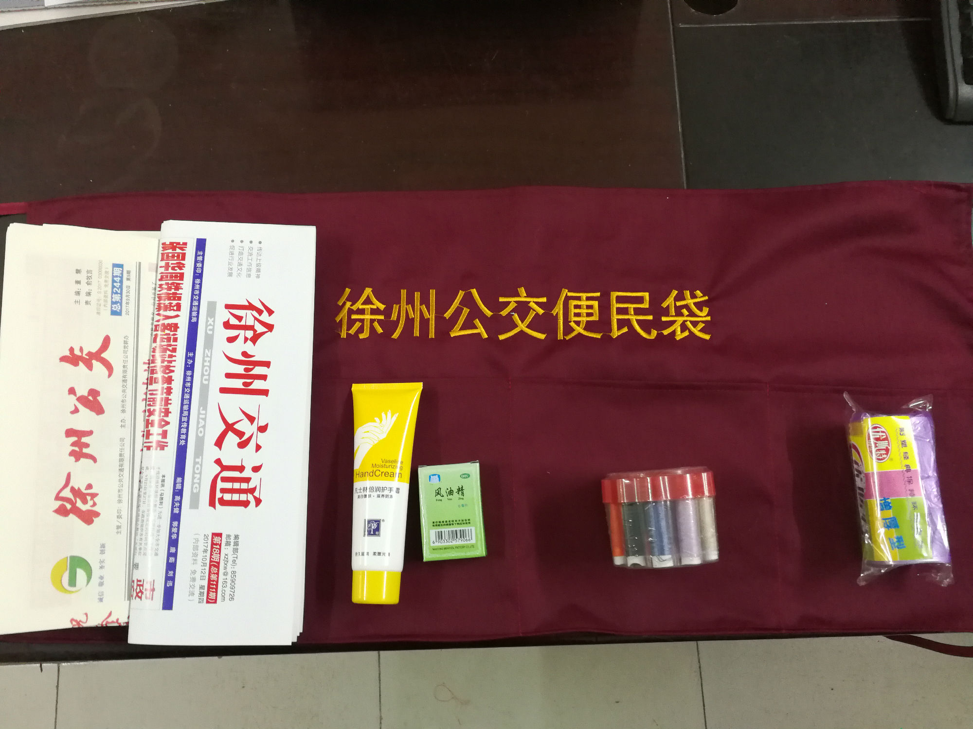 走進車廂,乘客會發(fā)現車廂前排座椅旁懸掛了一個“便民服務袋”,便民袋上有四個口袋,分別裝有乘車須知、一次性衛(wèi)生袋、報紙書刊、針線等,為乘客提供方便。目前,70多個便民袋已經安裝完畢。乘客看到后紛紛贊許,十分暖心。