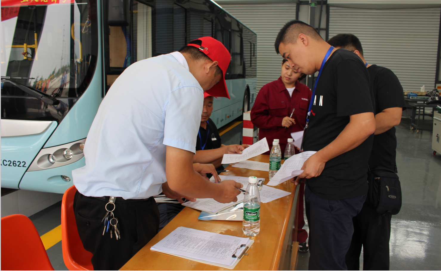 比賽開始了!參賽選手們穿戴整齊的工作服,個個卯足了勁,整裝待發(fā)。整潔的維修車間兩個工作臺上,四組修理人員同時進行盤式制動器拆裝組合的項目比賽,四名裁判員認真對照標準計分,現(xiàn)場安靜得只聽見制動器拆裝時輕微的“啪啪”聲。一旁的4個檢修地溝上,分別停著4輛新能源純電動公交車,同時進行著新能源車電控故障排除項目的比賽。參賽人員時而在駕駛室時而在車廂尾部檢修電路,裁判員根據(jù)實際操作隨機提問、記錄。